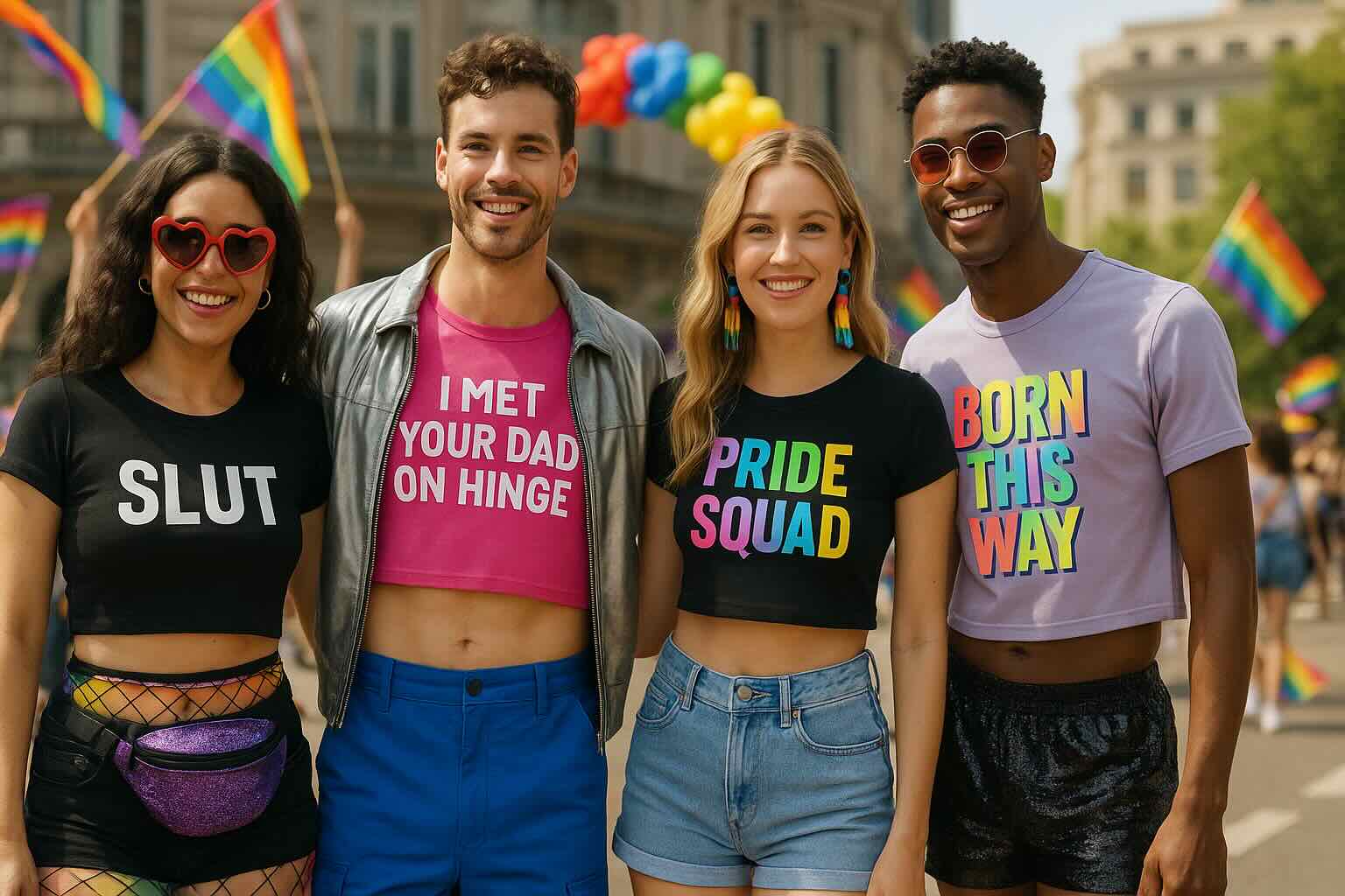 Planning a group look for your chosen family? Go for matching tees with slogans like “Pride Squad” or “Born This Way” in vibrant neon colors. Pair with denim cutoffs and statement earrings for the girls, or sequined shorts and platform sneakers for the boys. Add a custom touch with each person’s name or a nod to queer icons like Lady Gaga or RuPaul. Check out our shop for inspiration, and vibe to our Pride 2025 playlist featuring bops like “Vogue” by Madonna and “Espresso” by Sabrina Carpenter to get in the mood.